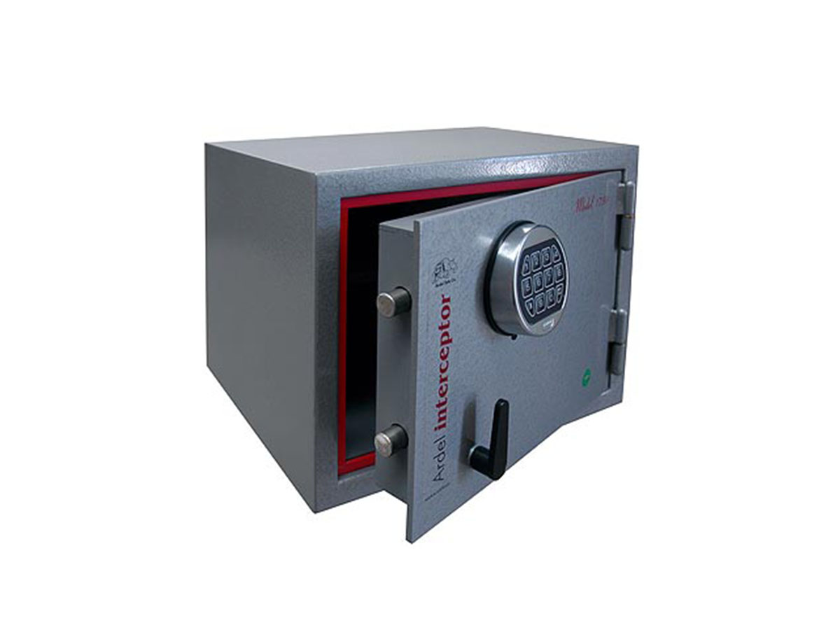This safe has a capacity of 17 litres and weighs approximately 50kgs. Security features include four point locking, two retractable stainless steel bolts, intumescent fireseal, relocking, and a high surface area to height ratio. The safe will accomodate A4 sized documents, plus 85mm of shelf space.