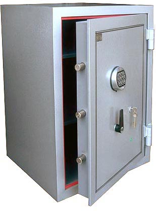 This large concrete encased commercial safe has a capacity of 133 litres and weighs approximately 350 kg. Security features include 10 mm steel plate door, six point locking, three retractable 25 mm diameter solid stainless steel bolts, and re-locking. Wall thickness 50 mm. It has one adjustable shelf. There are two 16 mm holes in the base for anchoring. Additional shelves optional. One hour fire resistance. Suggested insurance cash rating $25-$30 K.